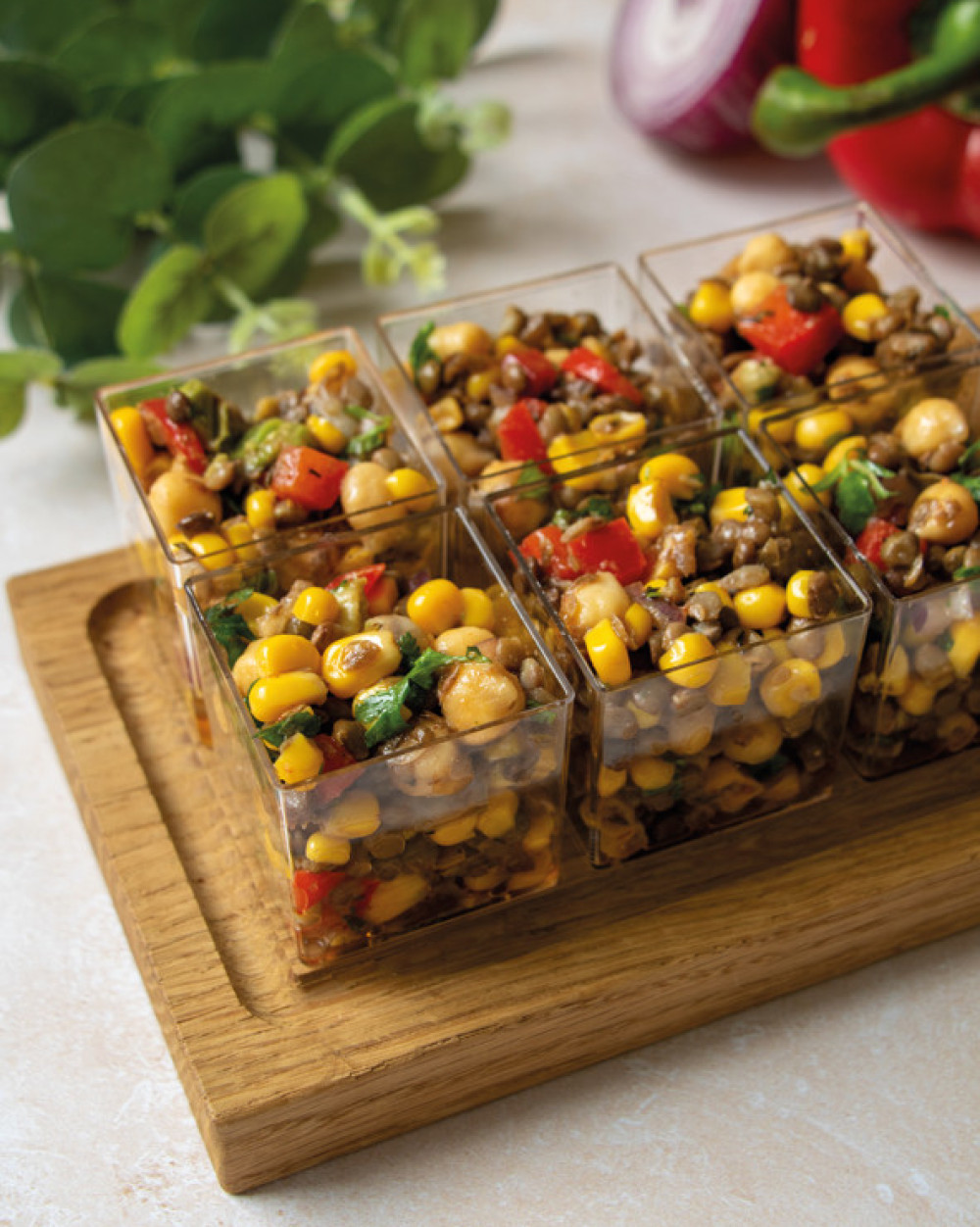 Pois chiches, lentilles, avocat, maïs, poivrons rouges, oignons rouges, coriandre, épices mexicaines