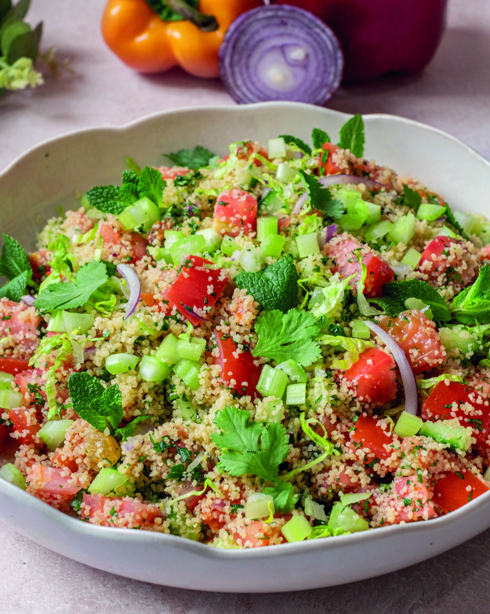 Semoule de blé, raisins golden, tomates fraîches, coriandre, concombre, oignons rouges, poivrons, menthe, citron, huile d’olive