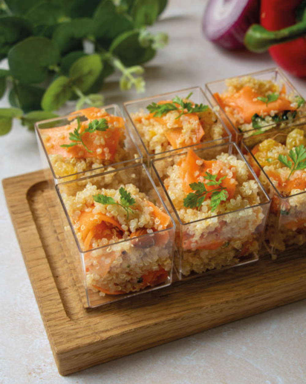 Quinoa, carottes, amandes, coriandre fraîche, miel, oranges, raisins golden, vinaigrette