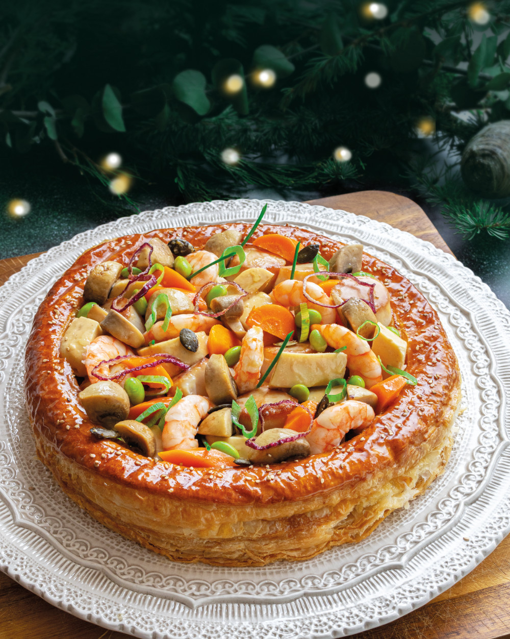 Saint Jacques, carottes, crevettes, champignons, fèves de soja, sauce bisque de homard